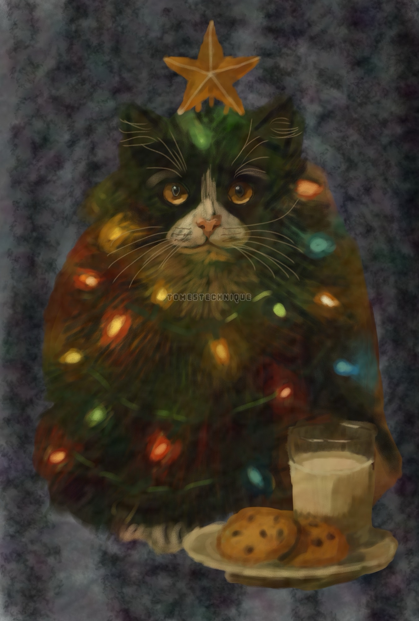 It’s finally happening. This dreamboat kitten’s staying up all nite and catching Santa in the act. Though, seriously, this is what cats are trying to do when they roll themselves up in your lights. I’m just glad it’s almost over, folks.