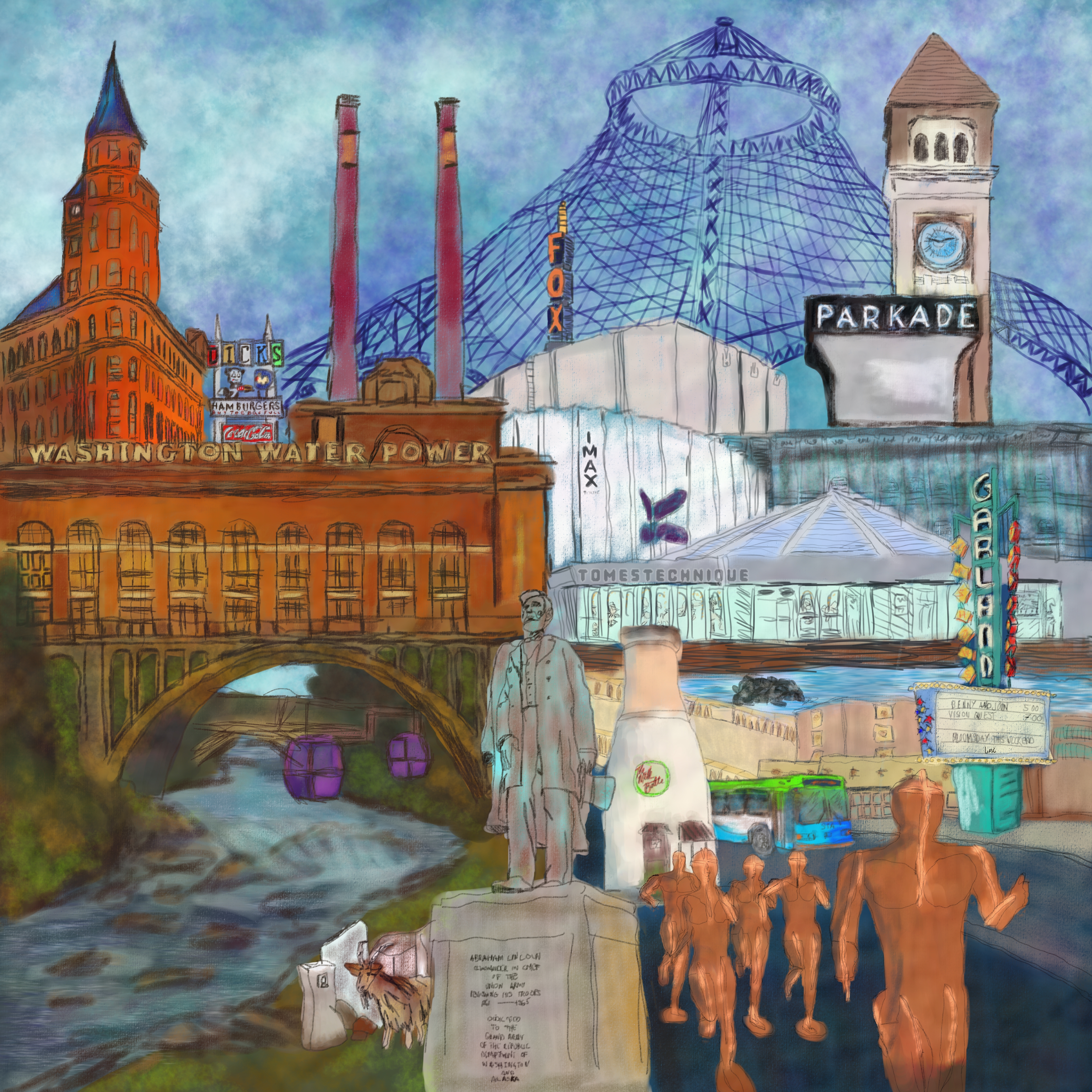 A complex commission comes in. Inspired by Spokane, Washington. I’m not familiar with the original sketch artist, but I’m to recreate the scene and colorize it. An excuse to roam a new city? I need none.
